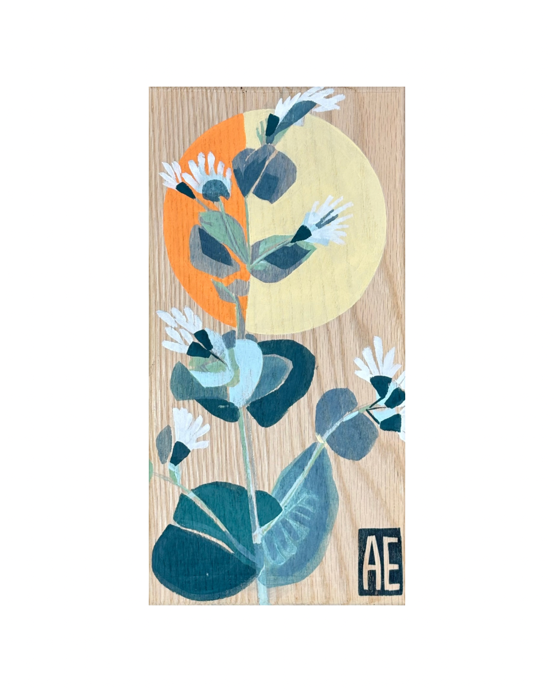 Eucalyptus/Living Stone – acrylic ink brushwork on solid oak panel with routed edges and a keyhole mount so that the piece hangs flush to the wall.