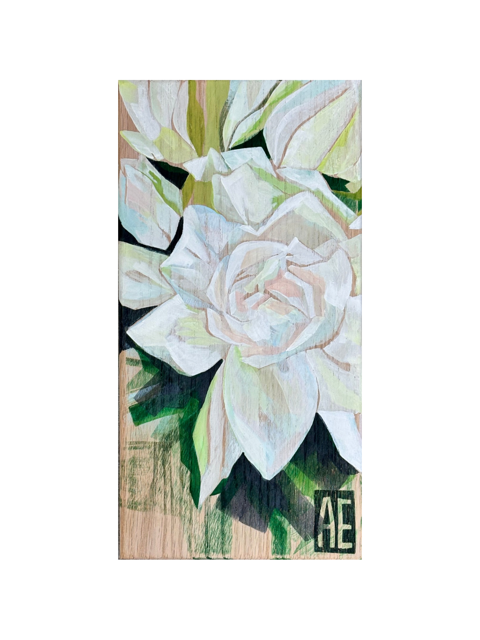Gardenia – acrylic ink brushwork on solid oak panel with routed edges and a keyhole mount so that the piece hangs flush to the wall.