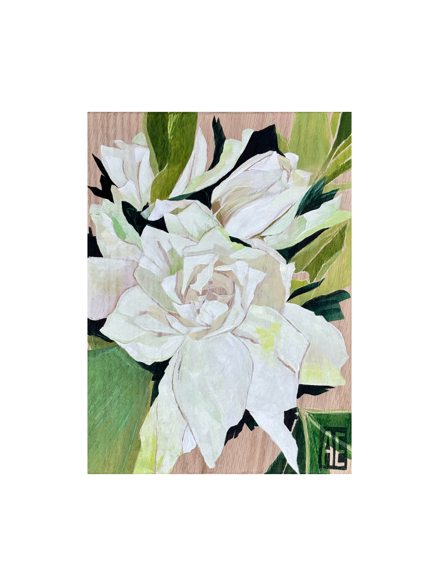 Gardenia – acrylic ink brushwork on solid oak panel with routed edges and a keyhole mount so that the piece hangs flush to the wall.