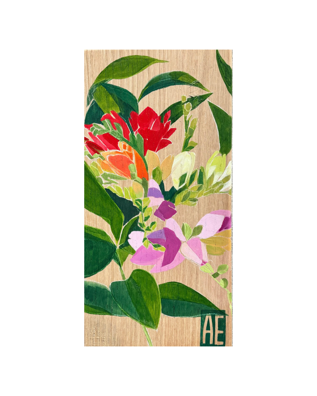 Golden Hour Bud Bouquet – acrylic ink brushwork on solid oak panel with routed edges and a keyhole mount so that the piece hangs flush to the wall.