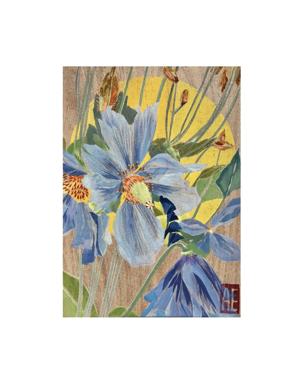 Himalayan Blue Poppy – acrylic ink brushwork on solid oak panel with routed edges and a keyhole mount so that the piece hangs flush to the wall.