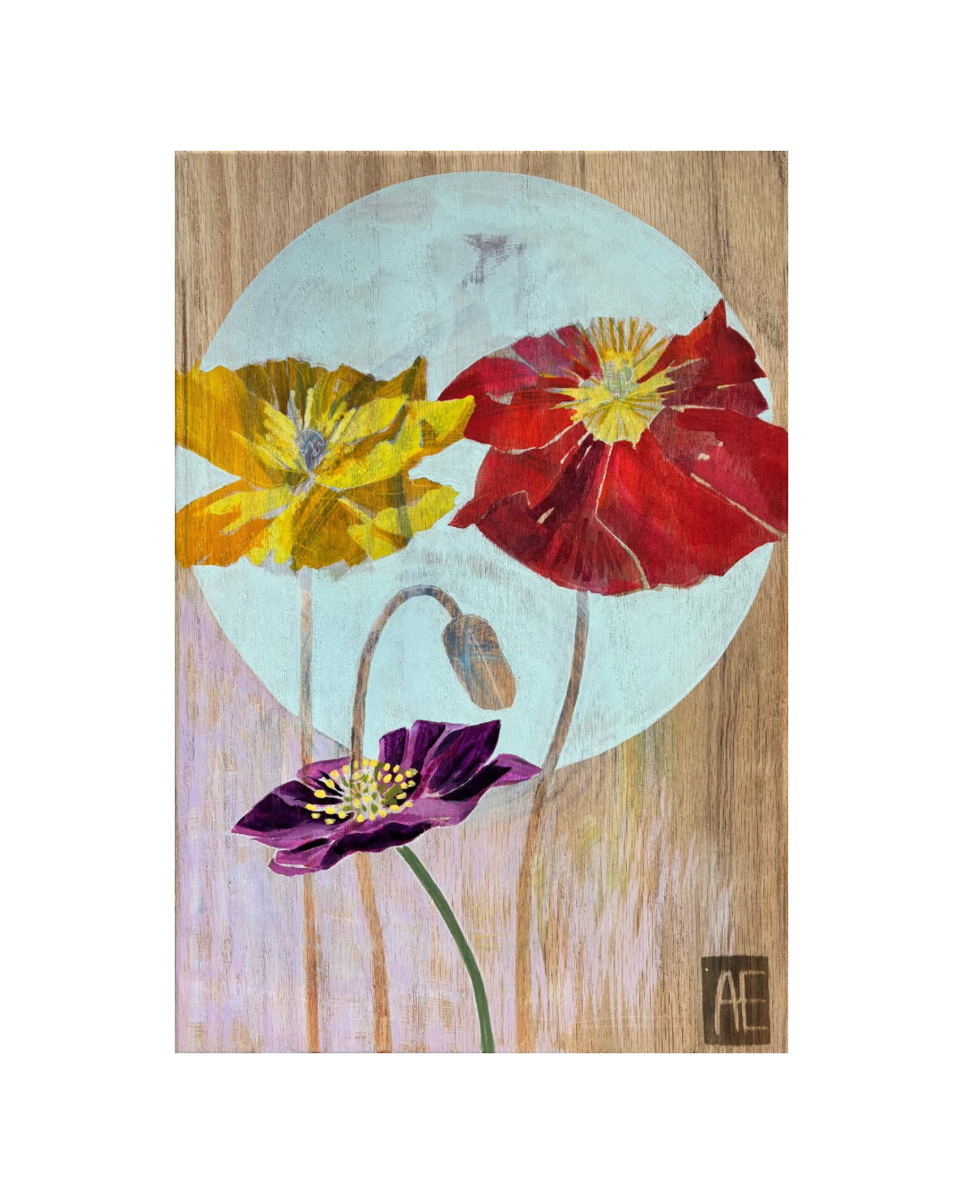 Icelandic Poppies – acrylic ink brushwork on solid oak panel with routed edges and a keyhole mount so that the piece hangs flush to the wall.