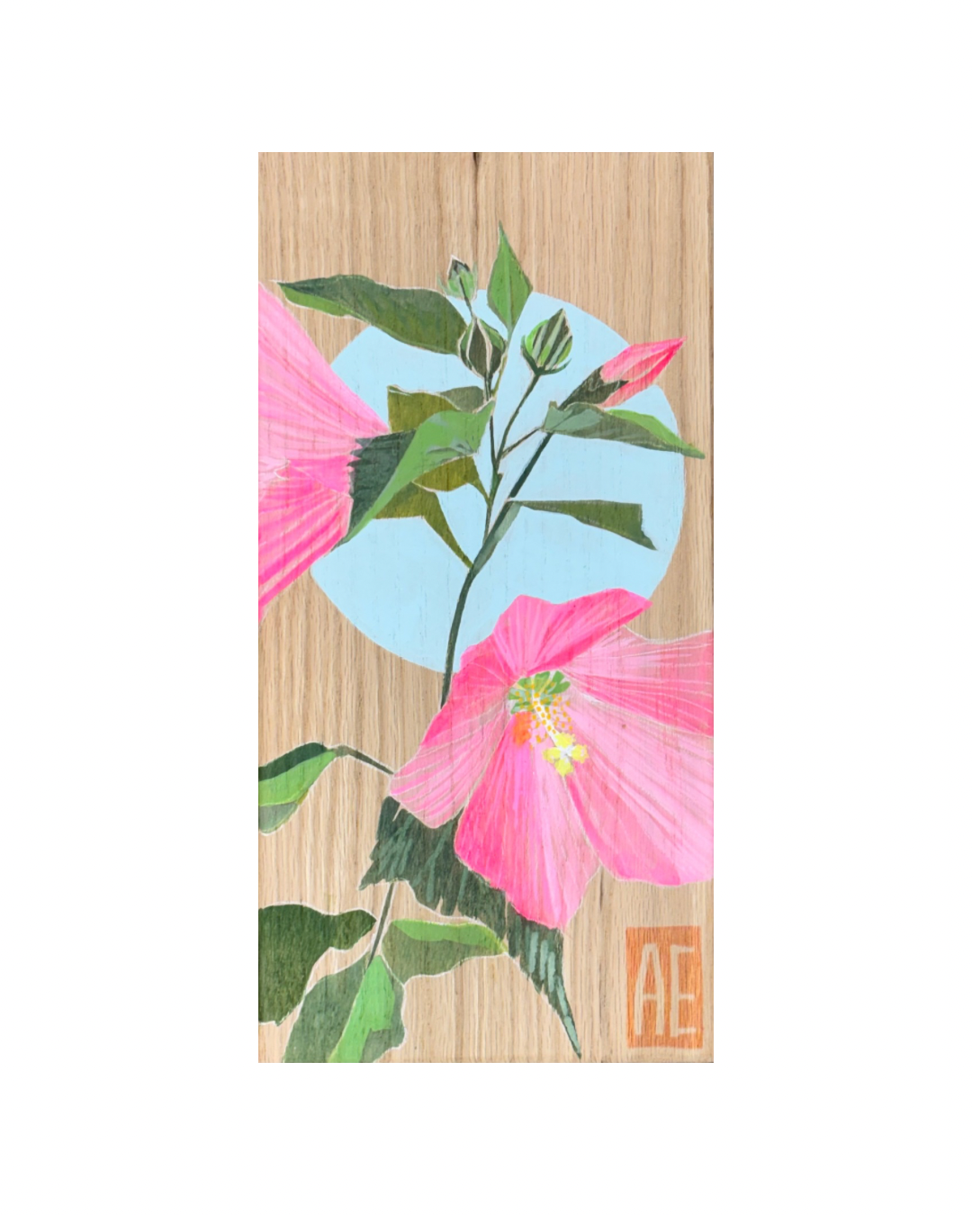 Hibiscus – acrylic ink brushwork on solid oak panel with routed edges and a keyhole mount so that the piece hangs flush to the wall.