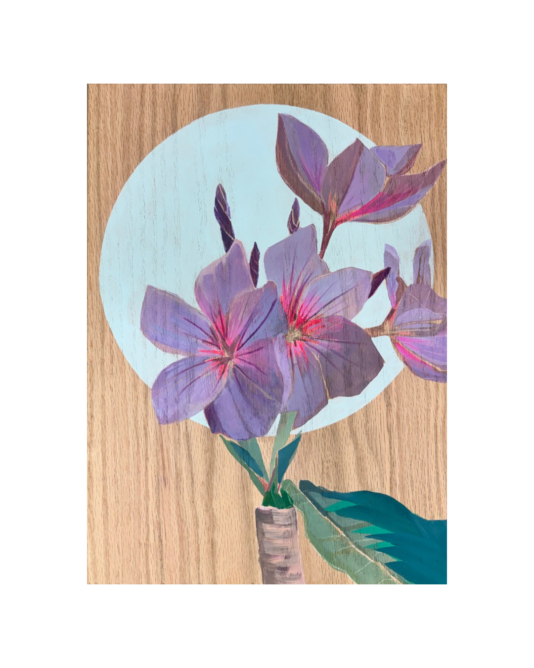 Plumeria – acrylic ink brushwork on solid oak panel with routed edges and a keyhole mount so that the piece hangs flush to the wall.